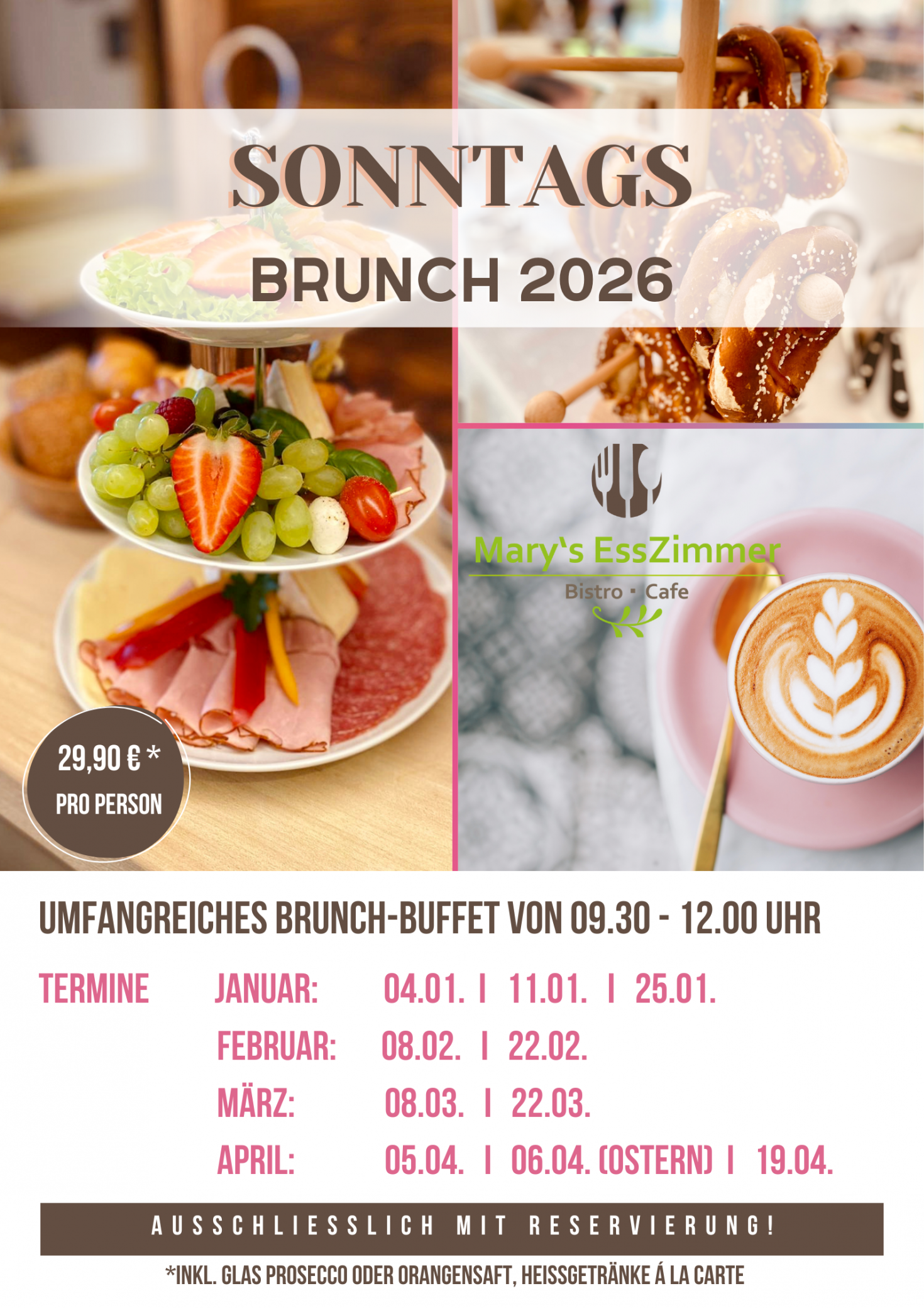 Sonn- und feiertags haben wir geschlossenAschermittwoch Abends geöffnetAb 18.00 Uhr mit Fisch-Spezialitäten.(Unbedingt reservieren!)Sonntags-Brunch-Termine25. Januar 202608. Februar 202622. Februar 202608. März 202622. März 2026